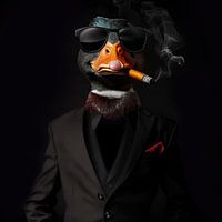 De zwarte achtergrond zorgt voor een krachtig contrast, waardoor de details en kleuren van de eend extra goed tot hun recht komen. Rijke oranje- en bruintinten in de veren, subtiele grijstinten in de sigaar en diepe zwarte accenten in de zonnebril zorgen voor een levendig geheel dat direct de aandacht grijpt.