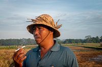 Portret van een eenden boer gedurende de zonsopkomst in Ubud, Bali. De man heeft een rieten hoedje op en rookt een sigaret.