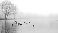 Ik liep lang het water. Het was heel stil vanwege de mist. De eenden trokken zich daar niets van aan en waren druk aan het zwemmen en fladderen. Ondanks de mist voelden ze toch dat het voorjaar was.
