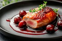Een heerlijk gepresenteerd bord dat meteen in de smaak valt. De malse eendenborst, omringd door sappige, mollige kersen en een verleidelijke glans, wekt de eetlust op en wekt de verwachting van culinaire ervaringen. Dit kunstwerk is perfect voor de keuken of eetkamer en brengt elke fijnproever in de juiste stemming.
