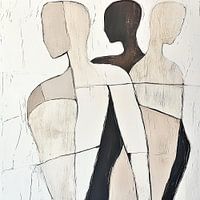 Drie abstracte figuren die dicht bij elkaar staan, met hun vormen subtiel verweven. De figuren zijn weergegeven in een minimalistische stijl, waarbij zachte aardetinten zoals beige, wit en lichtbruin worden gecombineerd met donkere, bijna zwarte accenten. De gezichten van de figuren zijn ongedetailleerd, wat de nadruk legt op hun samenzijn en de onderlinge relaties, eerder dan op individuele kenmerken.