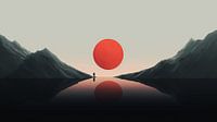 In het hart van een verstilde natuur staat een eenzame figuur aan de rand van een kristalhelder bergmeer, ondergedompeld in de contemplatie van een majestueuze rode zon die perfect tussen de imposante bergtoppen balanceert.