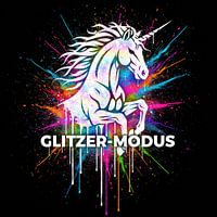 Afbeelding van een eenhoorn met verfspatten op de achtergrond. De tekst "GLITZER-MODUS" staat in het midden tegen de eenhoorn.