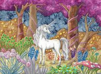 Dit aquarelschilderij in vele heldere kleuren toont een mystieke eenhoorn in een magisch bos met bomen en planten in prachtige kleuren en vormen.