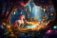 Een magisch bos waar eenhoorns in volledige harmonie en rust leven, omringd door de magie van de natuur.