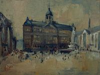 Koninklijk Paleis Amsterdam met daarvoor het Monument ter herinnering aan den volksgeest van 1830-1831. Bovenop het monument staat een sculptuur die De eendracht vertegenwoordigt, ook wel Naatje van de Dam genoemd werd. Een stadsgezicht uit 1900, vrolijk en spontaan geschilderd in olieverf.