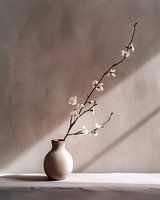 Een minimalistisch stilleven waarin eenvoud en natuurlijke schoonheid samenkomen. De delicate witte bloesemtak staat in een sobere, matte vaas van aardewerk en vangt het zachte licht in een serene compositie. De neutrale grijs- en zandtinten zorgen voor een kalme sfeer en maken dit kunstwerk uitermate geschikt voor een Japandi, wabi-sabi of Scandinavisch interieur.