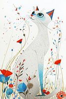 De kitten, die haast speels lijkt te zijn, wordt enkel door een verfijnde omtrek voorgesteld, wat de extreme minimalistische stijl benadrukt. Het ontbreken van overbodige details dwingt de kijker om te focussen op de puurheid van de vorm en de beweging in het werk. De veldbloemen voegen een natuurlijk en subtiel contrast toe, met zachte tinten die harmonieus samenvloeien met de lijnen van de kitten.