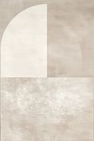 Een subtiel beige en wit kleurenschema met geometrische vormen vertegenwoordigt de eenvoud van Japandi design. De achtergrond is een gestructureerd oppervlak dat diepte toevoegt aan de minimalistische compositie. Een grote halvemaanvorm in het midden creëert een open ruimte voor tekst of afbeeldingen. Dit abstracte patroon vult het grootste deel van het doek. Het heeft een zacht gradiënteffect van lichtgrijs in de linkerbovenhoek, dat vervloeit in medium tinten aan de rechteronderkant.