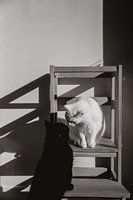 De zwarte en de witte kat die elkaar liefdevol begroeten in een mooi lijnenspel.