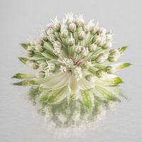 "Eenvoudig stilleven: Weerspiegeling van een Zeeuws knoopje" is een macrofoto van een prachtig wit/crème bloemetje van een Astrantia Major ( in Nederland wordt deze plant ook wel "Zeeuws Knoopje" genoemd). Hel bloemetje bestaat zoals je op de foto kunt zien uit heel veel "kleine bloemetjes" wat prachtige details geeft op de foto. Voor deze foto heb ik dit bloemetje op een speciaal reflecterend materiaal gelegd, zodat het bloemetje ook in het grondvlak te zien is maar dan in een aparte versie en op zijn kop.