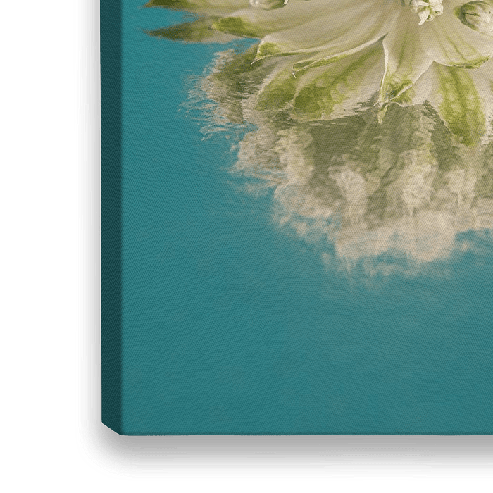 Koop dit bloemen kunstwerk Eenvoudig stilleven in petrol: Weerspiegeling van een Zeeuws knoopje van Marjolijn van den Berg op canvas, aluminium dibond, (ingelijste) fotoprint, behang en ArtFrame, op maat geprint in Fine-Art kwaliteit.