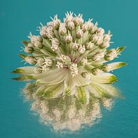 Deze foto van een Astrantia Major, (in Nederland wordt deze plant ook wel Zeeuws Knoopje) is gemaakt van enkel een crème witte bloemetje van deze plant die ligt op een weerspiegelend oppervlak, wat niet glad is. Hierdoor ontstaat er een abstracte weerspiegeling van de bloem. Als je inzoomt kun je dit goed zien. Ook kun je dan zien hoe scherp de voorste "bloemetjes" zijn.