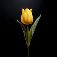 De diepe zwarte achtergrond vormt een contrastrijk canvas, waardoor de gele tulp en de dauwdruppels nog indrukwekkender naar voren komen. Het lijkt alsof de bloem zweeft in een tijdloze, mysterieuze duisternis, waarin alleen de tulp en haar dauwdruppels schijnen te bestaan.