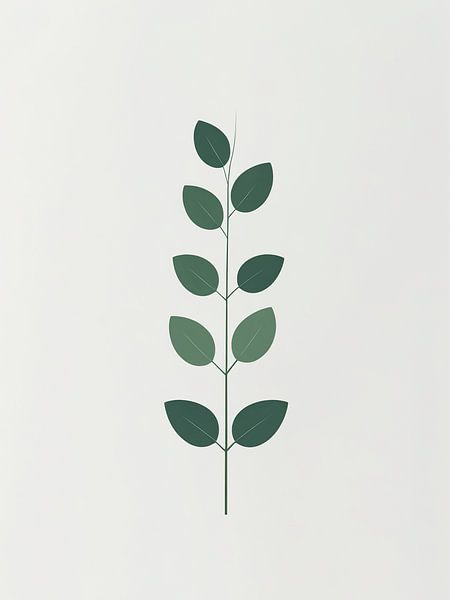 Een minimalistische botanische illustratie van een delicate eucalyptustak met afwisselend ovale bladeren in zachte salie- en bosgroene tinten. Het strakke, moderne ontwerp vangt de natuurlijke gratie van de plant's met subtiele aderdetails. Perfect voor spa-decor, wellness-branding, moderne botanische prints, materialen voor…