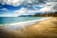 Eenzaam groot zandstrand met bergketen en bewolkt natuurlandschap