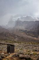 Eenzaam toilet hokje op de flank van de Kilimanjaro in Tanzania tijdens een bewolkte en mistige dag. In de verte is de top zichtbaar met sneeuw en ijs.