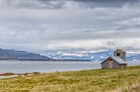 Een verlaten huisje in de middle of nowhere in IJsland. De achtergrond een prachtig fjord met een besneeuwde bergen.