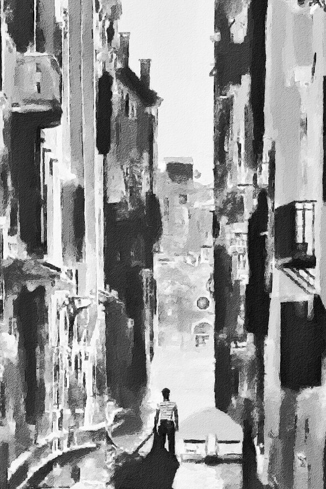 'Eenzaam in Venetië' is een digitaal kunstwerk in zwart-wit gecreëerd door een fusie tussen een tekening en een schilderij. De tekening is gemaakt met tekentechnieken van potlood en houtskool, en het schilderij bestaat uit meerdere lagen van diverse schildertechnieken.
