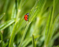 Een lieveheersbeestje dat eenzaam het plantje beklimt als een ware kampioen in een oerwoud van groen.
