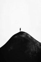 Een eenzame figuur staat op een opvallende zwarte heuvel, afgetekend tegen de helderwitte achtergrond. Deze contrastrijke compositie geeft een gevoel van isolatie en grootsheid. De zachte lijnen van de heuvel omlijsten de persoon en symboliseren een reis in het oneindige of de zoektocht naar de zin van het leven.