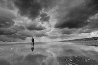 Eenzaam op het strand in gezelschap van mijn eigen reflectie. Buien luchten nog net licht gekleurd door de zonsondergang, een klein streepje duinen. omgezet in zwart wit
