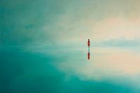 Er ontvouwt zich een dromerige scène in zachte blauw- en groentinten, waarin een mysterieuze figuur in een rode jurk majestueus op het spiegelende water staat. Deze harmonieuze illusie nodigt uit tot nadenken en dromen en creëert een kalme, meditatieve sfeer die perfect is voor de slaapkamer of woonkamer.
