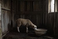 In een serene en nostalgische setting staat een eenzaam schaap in een oude, houten schuur. De zachte verlichting valt door het raam en benadrukt het rustige karakter van de ruimte. Het schaap buigt zijn hoofd naar een eenvoudige, witte emmer, alsof het water zoekt in de stilte. De verweerde houten planken van de schuur versterken het rustieke gevoel en creëren een tijdloze sfeer die doet denken aan landelijke eenvoud en nostalgie. Perfect voor iedereen die de puurheid en eenvoud van het boerenleven waardeert, deze afbeelding brengt een vleugje rust en authenticiteit in elke ruimte.