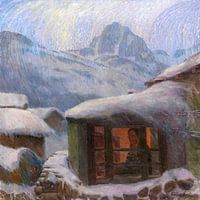 Achter het huis onder de sneeuw zijn bergen te zien achter de neerslag in paars en geel.