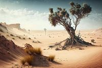 Een eenzame boom rijst op in het midden van een uitgestrekte woestijn, zijn silhouet steekt duidelijk af tegen de uitgestrektheid van gouden zandduinen. De schaarse vegetatie in het landschap benadrukt de stille kracht van de boom. Een gedeeltelijk bewolkte lucht filtert het zonlicht over het heuvelachtige terrein en werpt zachte schaduwen die de natuurlijke contouren van de duinen benadrukken. Deze rustige en contemplatieve scène legt de essentie van veerkracht en de schoonheid van eenzaamheid in de natuur vast.