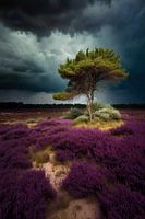 Dit fascinerende kunstwerk toont een eenzame boom die oprijst uit een uitgestrekt veld met bloeiende paarse heide tegen een sfeervolle lucht met donkere, wervelende stormwolken. De levendige lavendeltinten van het landschap vormen een schril contrast met de dramatische, broeierige sfeer erboven. Rijk aan textuur en emotie roept deze…