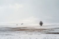 In een uitgestrekt winters landschap staat een eenzame boom als anker in een wereld van sneeuw en nevel. De zachte glooiingen van de heuvels verdwijnen in het bleke licht, terwijl de horizon oplost in stilte. Subtiele tinten van wit, grijs en aardebruin geven dit minimalistische winterlandschap een verstilde diepte. De compositie ademt…