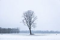 Op deze foto is een eenzame boom te zien in de sneeuw in de polder van Drunen. De sneeuw bedekt de grond en de bomen in de omgeving, terwijl deze ene boom er eenzaam en indrukwekkend uitziet. De takken zijn bedekt met een laagje sneeuw, wat de schoonheid van deze boom alleen maar benadrukt. De lucht is helder, waardoor het contrast tussen sneeuw en boom nog duidelijker wordt. Deze eenzame boom staat als een symbool voor de kracht en de schoonheid van de natuur.