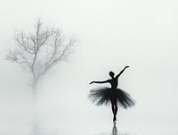 Haar elegante en gracieuze bewegingen stralen verfijning uit, maar roepen ook een diep gevoel van eenzaamheid en reflectie op. In de achtergrond doemt een kale boom op, gehuld in mist, wat de sfeer van koude winterdagen versterkt.