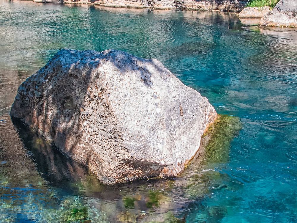 Eenzame Rots Midden In De Schitterde Turquoise Gekleurde Stromend Rivier. Koprulu Canyon bevind zich in Antalya Turkije.