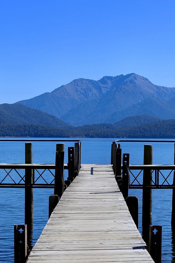 Te Anau, steiger, Nieuw-Zeeland, meer, rust, natuur, bergen, reflectie, minimalistisch, wanddecoratie, inspiratie, sereniteit