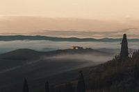 Eenzame Toscaanse boerderij in het heuvelachtige Toscaanse landschap in de ochtendmist
