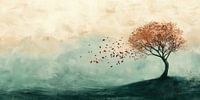 Dit serene waterverfschilderij vangt de essentie van de herfst, waarbij een eenzame boom centraal staat tegen een mistige achtergrond. De rode bladeren die wegwaaien symboliseren verandering en het verstrijken van de tijd, terwijl de zachte kleuren en de mistige sfeer een gevoel van melancholie en rust oproepen. Het werk nodigt de kijker uit om na te denken over de schoonheid van vergankelijkheid en de cyclus van de natuur.