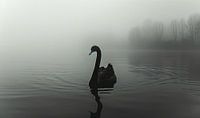 Dit kunstwerk toont een zwarte zwaan die sierlijk over een mistig meer glijdt, omgeven door een dikke nevel die de hele scène in een dromerige sfeer hult. De zwaan bevindt zich centraal in de compositie, met zijn donkere silhouet scherp afgetekend tegen de lichtgrijze achtergrond.