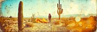 Dit nostalgische beeld toont een cowboy midden in de uitgestrekte, droge woestijn onder een felblauwe hemel. De warme, stoffige kleurtonen en vintage Polaroid-look geven het werk een bijzondere authenticiteit en voeren de kijker terug naar het tijdperk van het Wilde Westen. De levendige cactussen, het knisperende kampvuur en de uitgestrektheid van het woestijnlandschap creëren een sfeer van avontuur en vrijheid.