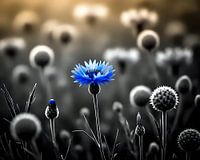 De foto toont een macro-opname van een schijnbaar eindeloos, monochroom bloemenveld waarin een enkele, intens gekleurde bloesem op de voorgrond alles overtreft. De omringende bloemen en stengels zijn zachtjes gedesatureerd, hun vormen versmolten tot een rustige textuur, waardoor de sterke kleur van de hoofdbloem des te beter uitkomt.…