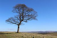 Een mooie eenzame loofboom, tegen een achtergrond van blauwe lucht en het natuurlijke landschap van open heide en heuvels, in het Peak District, in Derbyshire in het noordwesten van Engeland.