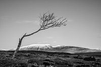Een eenzame boom op de hooggelegen veengebieden in de bergen van county Mayo in Ierland. Op de achtergrond de besneeuwde bergtoppen van de Nephin Beg Range Mountains. Deze foto is gepubliceerd in het fotoboek PEAT van Bo Scheeringa