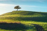 Eenzame boom op de top van een heuvel in Toscane en een spoor van ploegen in het veld.