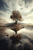 De eenzame boom in dit surrealistische landschap vertelt een verhaal van doorzettingsvermogen en eenzaamheid. Terwijl zijn takken kronkelen in de wind, kijkt hij uit over een wereld die hem niet begrijpt. Maar juist omdat hij alleen staat, valt hij op. Zijn schoonheid is uniek en tijdloos, en zal de aandacht trekken van iedereen die naar hem kijkt. Dit digitale schilderij zal niet alleen een statement maken in uw huis, maar zal u ook eraan herinneren dat het oké is om anders te zijn en dat er altijd schoonheid te vinden is in de eenzaamheid. Laat deze boom uw muur sieren en uw geest verrijken.