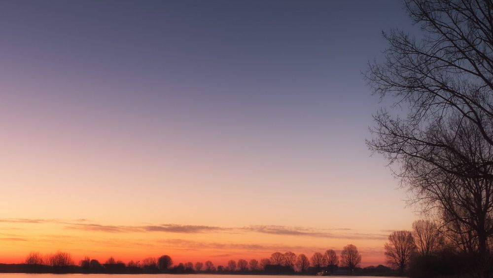 Net voor de zon opkomt is de lucht al vol van kleuren. De mooiste tinten zijn dan aan de hemel te zien. Doordat de lucht erg koud was was er weinig beweging. In de verte een klein wolkensliertje dat voor enig diepte zorgt, maar stil hangt in de ochtendlucht. Deze foto is gemaakt aan de oever van de Maas nabij Cuijk, Noord-Brabant. dit gebied staat ook wel bekend als de Maasheggen. Karakteristiek voor de Maasheggen is dat het landschap is verdeeld in een groot aantal kleine percelen die van elkaar zijn gescheiden door meidoorn- en sleedoornheggen. De Maasheggen liggen in Brabant in de uiterwaarden van de Maas in het gebied bij de dorpen Vierlingsbeek, Boxmeer en Oeffelt. Het eeuwenoude landschap is uniek in West-Europa, en de Maasheggen vormen een bijzonder ecosysteem waar een aantal zeldzame planten- en diersoorten voorkomen.