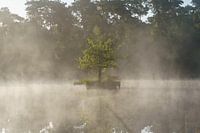 Midden in een groot plas een klein eiland met een boom in de ochtend omringd met een ochtendmist nevel.