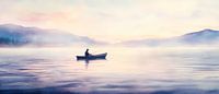 In zachte pasteltinten glinstert een eenzame kanovaarder in het glinsterende water, omringd door mystieke mist en glooiende heuvels op de achtergrond. Dit rustgevende tafereel straalt een gevoel van vrijheid en innerlijke vrede uit, perfect voor de slaapkamer of een meditatieve ruimte om ontspanning en sereniteit te bevorderen.