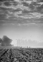 Een eenzame fietser rijd door het Noord-Hollandse landschap in Nederland. Foto in zwart wit. De fietser rijdt over een dijk door agrarisch landschap. Op de achtergrond vliegen vogels en staat een lantaarnpaal. De lucht is bewolkt.