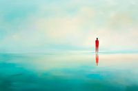 In een dromerige zee van mist staat een eenzaam rood silhouet, dat sterk contrasteert en sierlijk afsteekt. De zachte blauwe en witte tinten geven het beeld een kalme, mystieke sfeer. Ideaal voor de slaapkamer, waar het een rustgevende, contemplatieve stemming creëert en uitnodigt om te dromen.